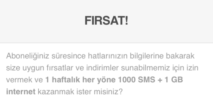 Türk Telekom veri işleme izni ile internet kullanımlarınız analiz edilerek diğer firmalara paylaşılır. Bu durumu bir sms ile iki dakikada iptal edebilirsiniz.
